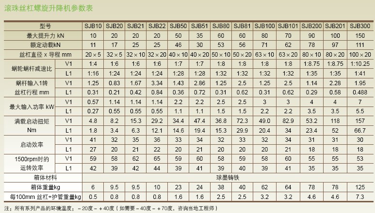 SJB系列滾珠絲杠螺旋升降機產品的壽命主要由滾珠絲杠的壽命及蝸輪蝸桿等零部件壽命決定;我們主要校核滾珠絲杠的壽命,蝸輪蝸桿會有磨損,但壽命一般比滾珠絲杠長。滾珠絲杠的預期壽命L10是90%的滾珠絲杠在金屬材料疲勞失效前所能達到或超過的運行距離。單位為百萬毫米。滾珠絲杠預期壽命L10并非是保質承諾,同時壽命的預期要在正確的維護,無污染物和正確的潤滑。