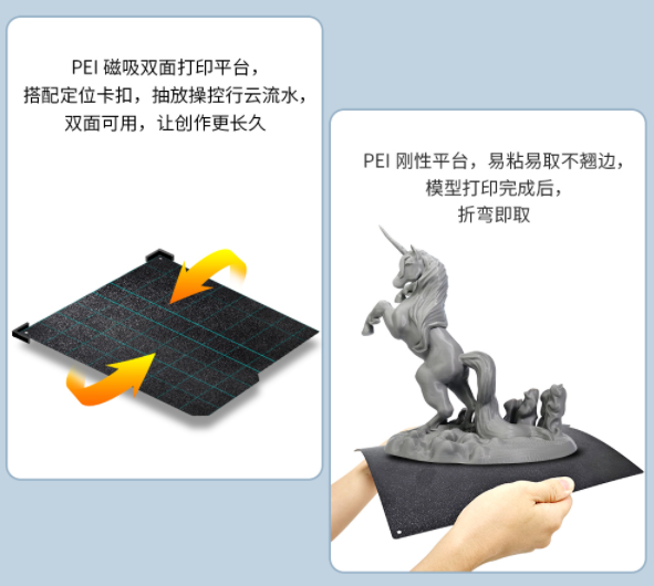 PEI磁吸雙面打印平臺,不僅雙面可用,在打印過程中更是易粘易取不翹邊,內(nèi)置的收納盒設計,不丟失每一個小細節(jié)。
