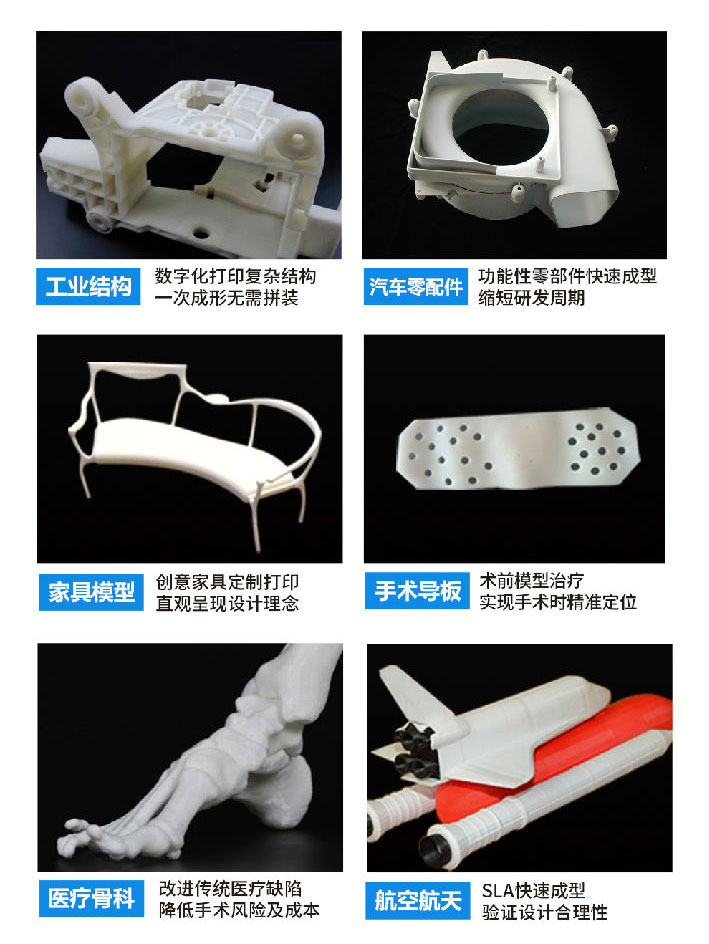 極光工業級SLA光固化3D打印機更是適配多種耗材,它支持透明、耐高溫、高強度等不同屬性的樹脂耗材,全方位滿足各行業客戶對材料特性的需求。廣泛用于醫療、文創、汽車、建筑、工業、航空航天、鞋類生產、教育、動漫等眾多領域。