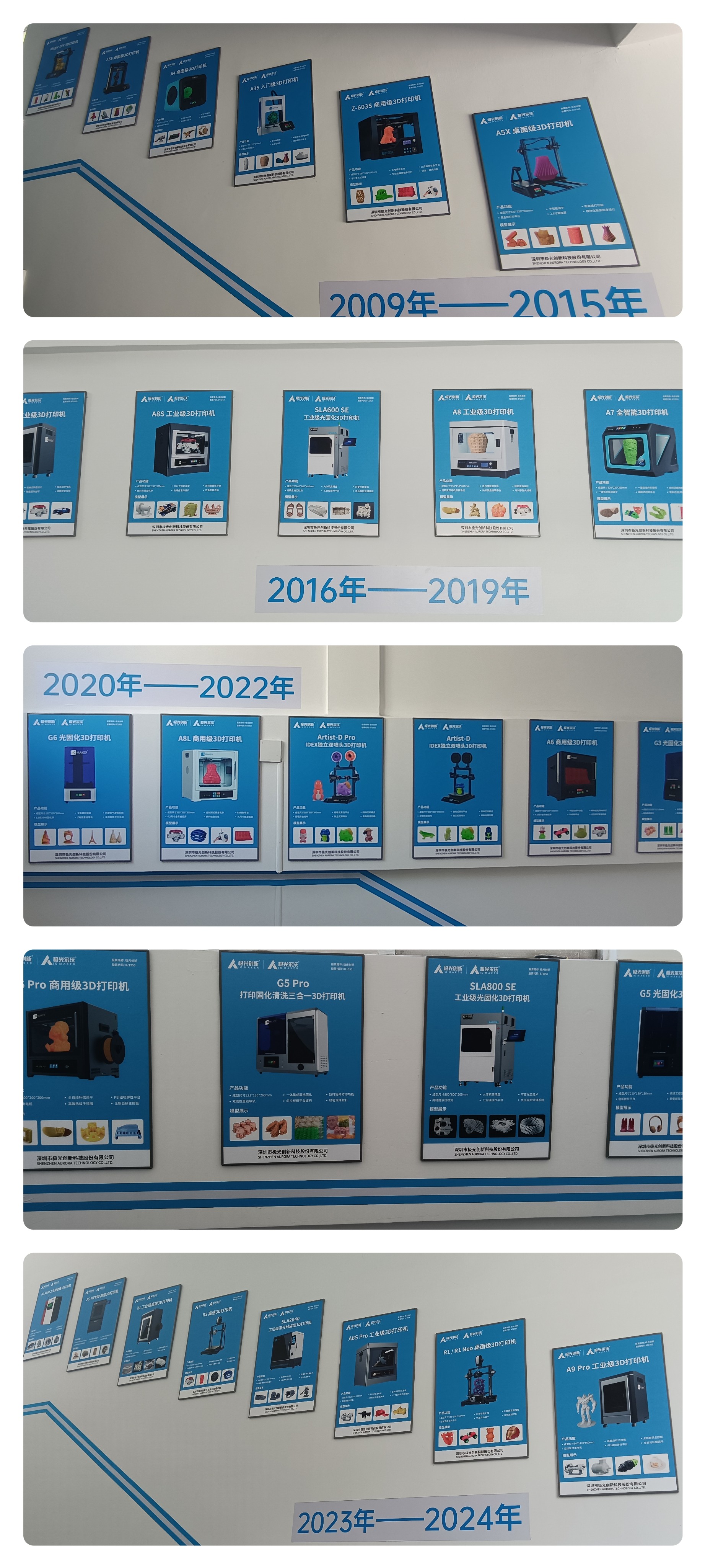 為了展現(xiàn)公司的發(fā)展歷程和輝煌成就,極光創(chuàng)新特意在入門處設(shè)置了產(chǎn)品展牌。從A5X到R2,從G3到G5 pro,從Z-603S到A8S,再到如今的工業(yè)級(jí)產(chǎn)品矩陣——SLA 2040、SLA 640、SLA 850、SLM 300等,每一款產(chǎn)品都是團(tuán)隊(duì)努力的智慧結(jié)晶。這些展牌如同一部時(shí)光機(jī),回顧著極光創(chuàng)新走過(guò)的每一步,帶領(lǐng)大家感受創(chuàng)新的力量。