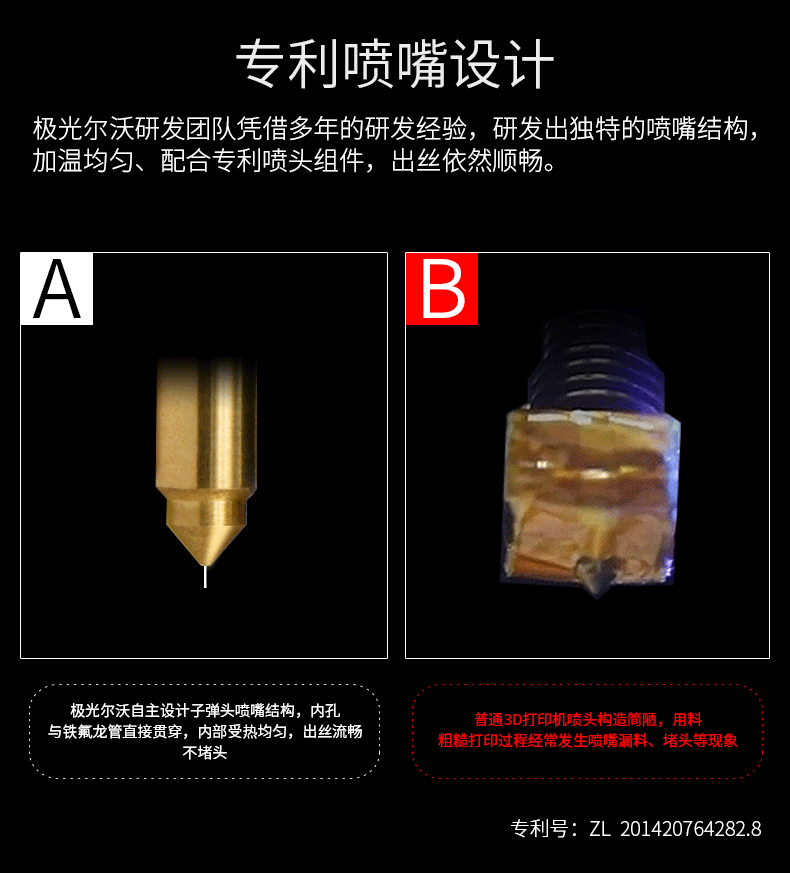 A8S使用了研發(fā)的專(zhuān)利噴頭,出絲更順暢,特殊的內(nèi)部構(gòu)型降低了堵頭風(fēng)險(xiǎn),提高了30%以上的使用壽命。CNC加工一體成型的打印平臺(tái),平整度更高,能夠有效提高噴頭的準(zhǔn)確定位。雙擠出機(jī)同步擠出,能夠保證擠出順暢,同時(shí)也降低了單擠出機(jī)容易出現(xiàn)的斷料風(fēng)險(xiǎn),對(duì)于中途更換材料也有極高的便利性。