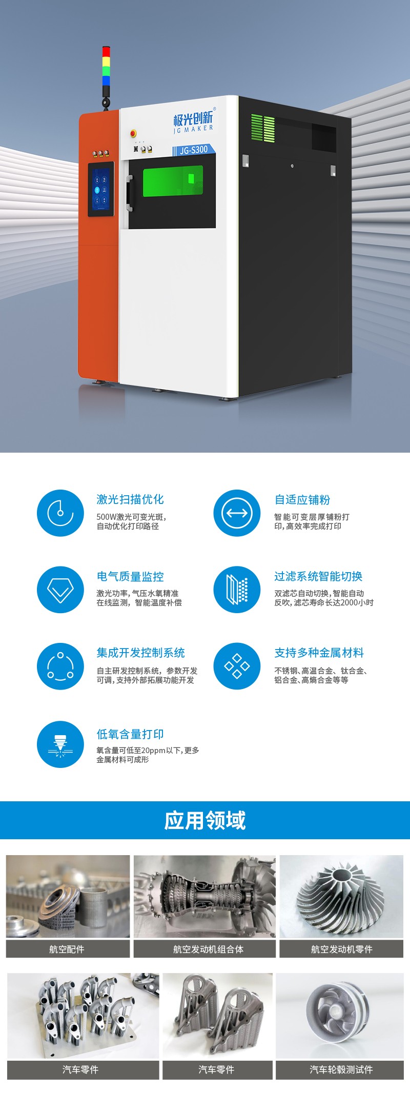 同時,作為3D打印行業(yè)的頭部企業(yè),極光創(chuàng)新一直緊跟市場步伐,積極研發(fā)出更適合市場需求的3D打印產品,日前推出的全新工業(yè)級金屬3D打印設備JG-S300,可以全方位滿足工業(yè)市場各領域用戶的需求,助力企業(yè)加快市場研發(fā)效率、降本增效的同時,不斷提升市場的占有率。
