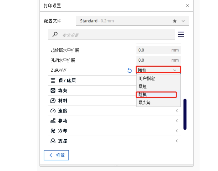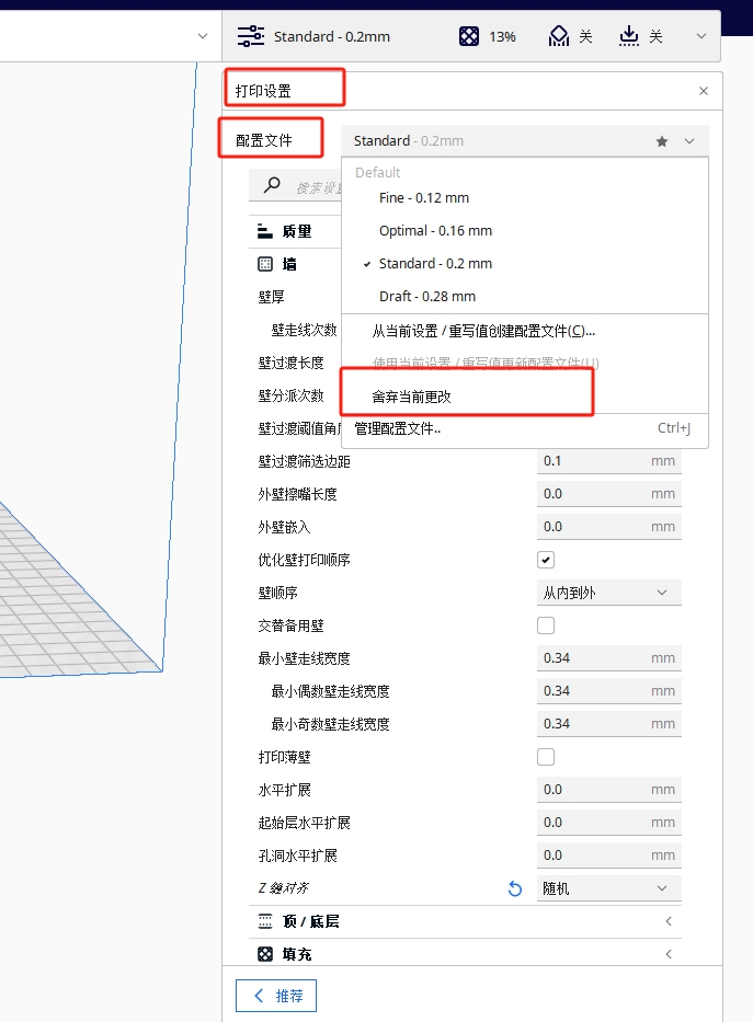 2.點(diǎn)擊“基本”,選擇“語言”,然后再點(diǎn)擊“簡體中文”,軟件頁面就成功切換成簡體中文了。 二、接縫問題 最近各種3D打印的刀、劍、棒模型火遍各大視頻平臺,很多小伙伴摩拳擦掌,躍躍欲試,可是也有些伙伴在模型打印完成后,遇到打印出來的模型甩不出來的問題。 小創(chuàng)在這里可以提供兩個(gè)解決的辦法: 1.是將模型擴(kuò)大,增加每層接縫之間的縫隙; 2.是調(diào)整Z軸距離,具體操作請看下圖。 在軟件右邊菜單欄選擇“墻”這個(gè)選項(xiàng),然后點(diǎn)擊“Z縫對齊”,最后選擇“隨機(jī)”就可以了。 三、如何恢復(fù)到默認(rèn)參數(shù)設(shè)置 還有一些愛探索的玩家,在打印不同的模型的時(shí)候喜歡自己去進(jìn)行參數(shù)設(shè)置,時(shí)間長了之后導(dǎo)致參數(shù)設(shè)置混亂,后面的模型打印不成功,然后又不知道該怎樣恢復(fù)到默認(rèn)參數(shù)設(shè)置!別急,小創(chuàng)來幫您。 很簡單,您只需在軟件右邊“打印設(shè)置”-“配置文件”中點(diǎn)擊“舍棄當(dāng)前更改”就可以恢復(fù)到默認(rèn)設(shè)置。 以上就是近期后臺小伙伴遇到的較多的問題,如果您還有其他問題需要解決,隨時(shí)可以在后臺私聊小創(chuàng),或者直接咨詢我們的售后客服哦!