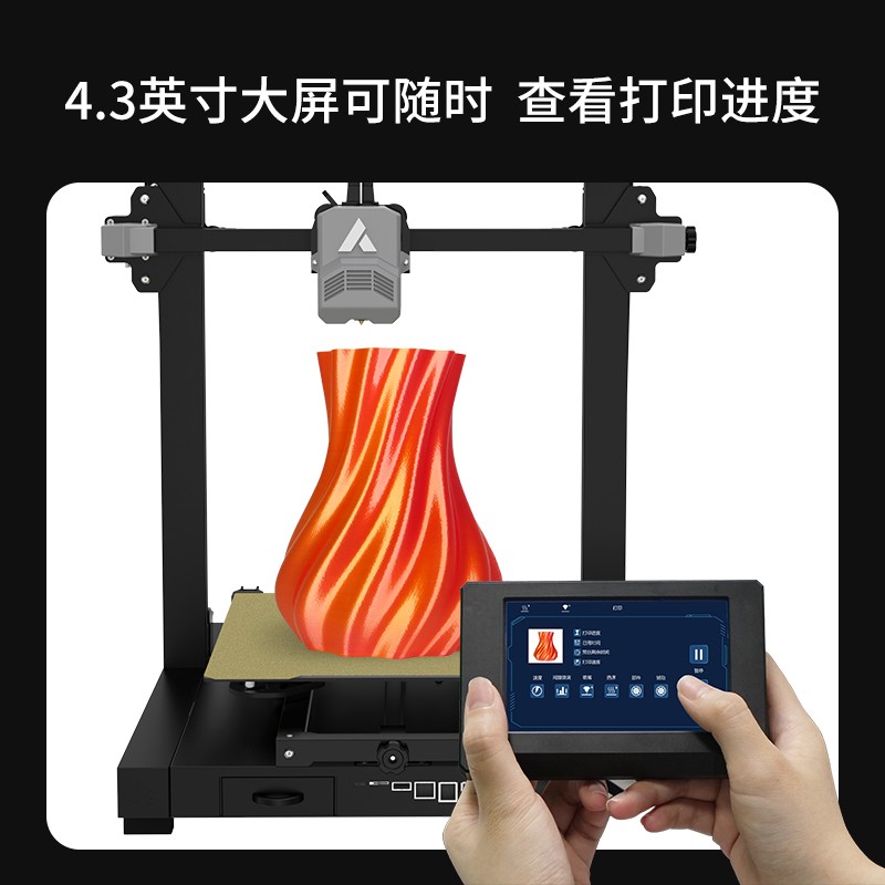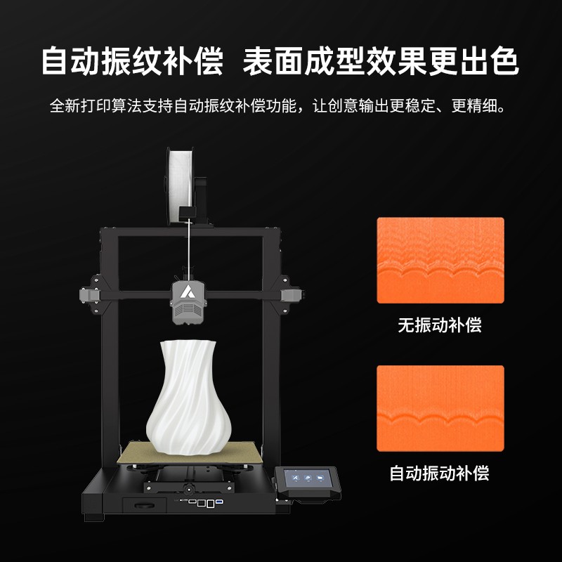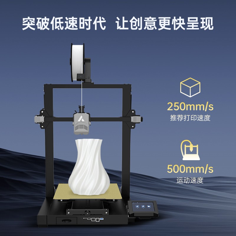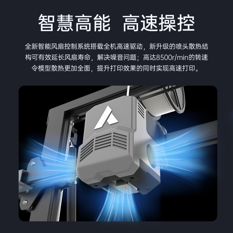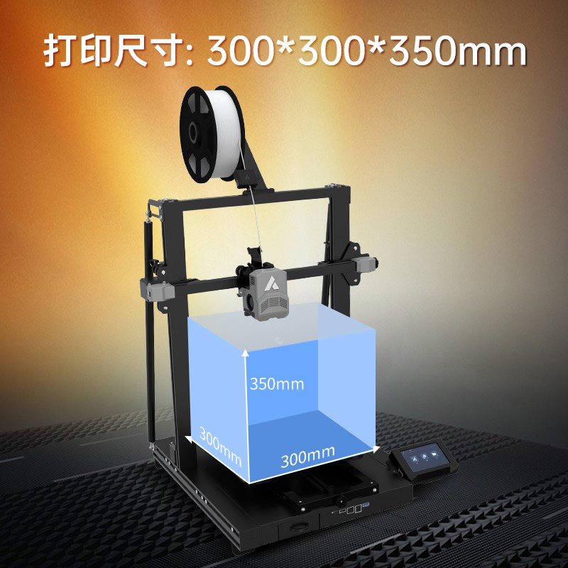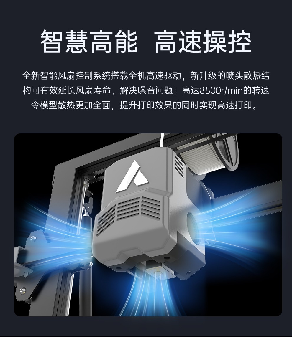 300*300*350mm最大成型空間·9.5倍放大擠出,使出料更均勻,成型更出色,搭載智能風扇控制系統,讓高達8500r/min的轉速降低噪音,還可以模型散熱更全面的同時高速打印