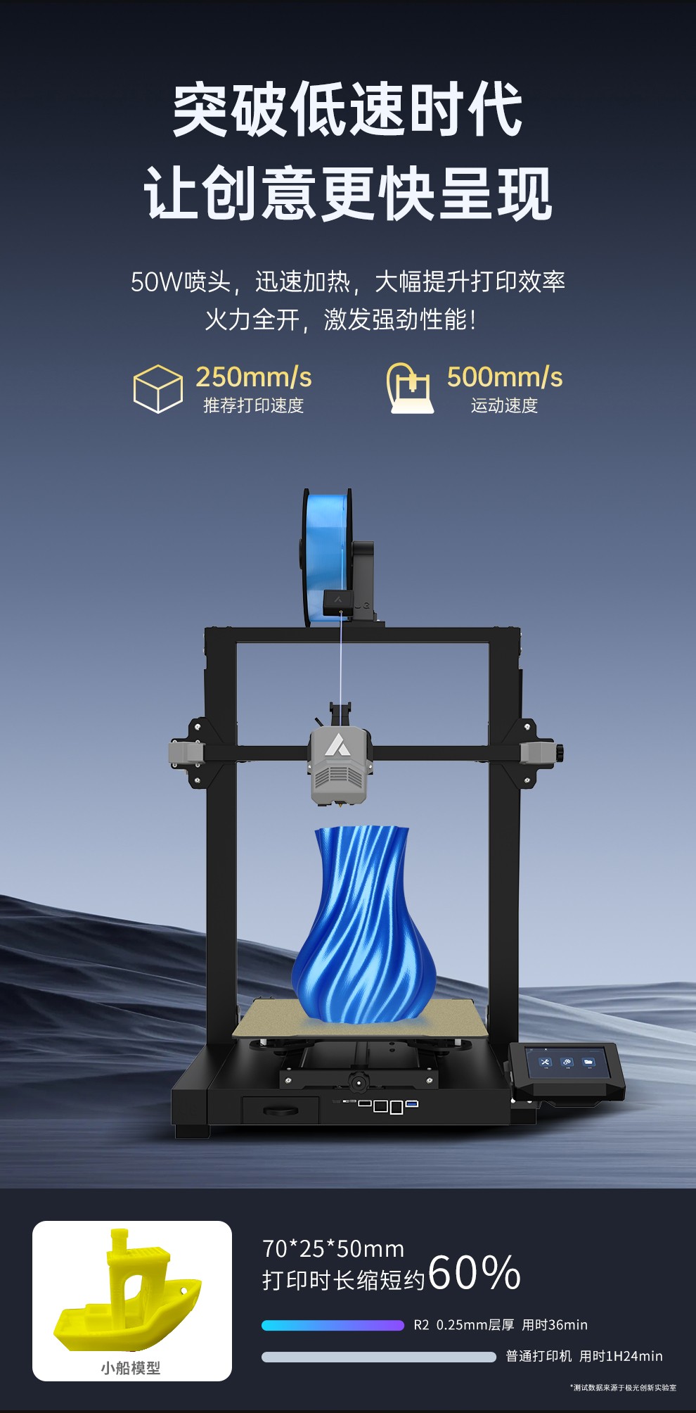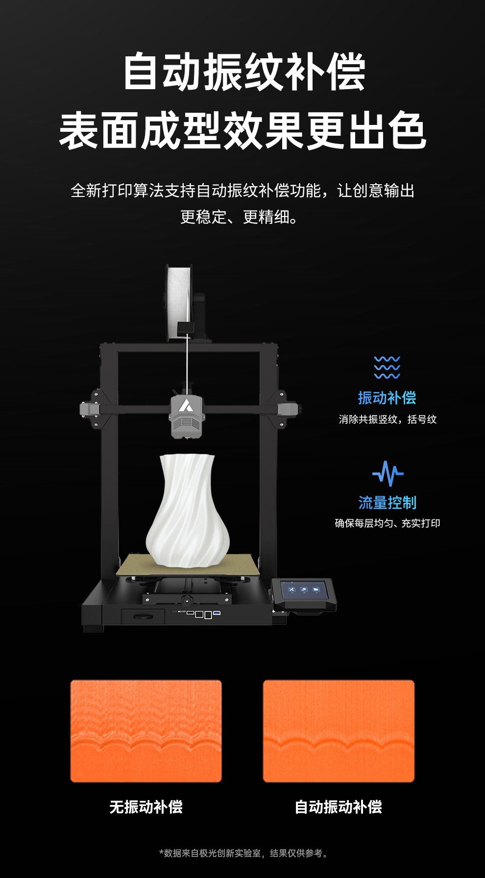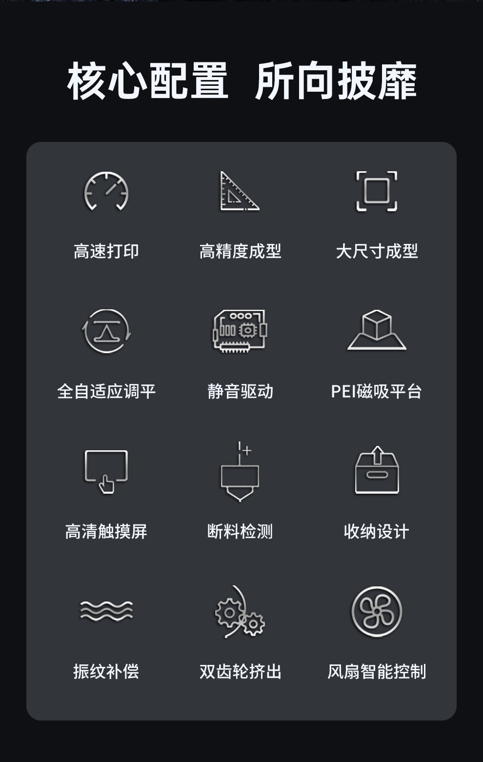 300*300*350mm最大成型空間·9.5倍放大擠出,使出料更均勻,成型更出色,搭載智能風扇控制系統,讓高達8500r/min的轉速降低噪音,還可以模型散熱更全面的同時高速打印