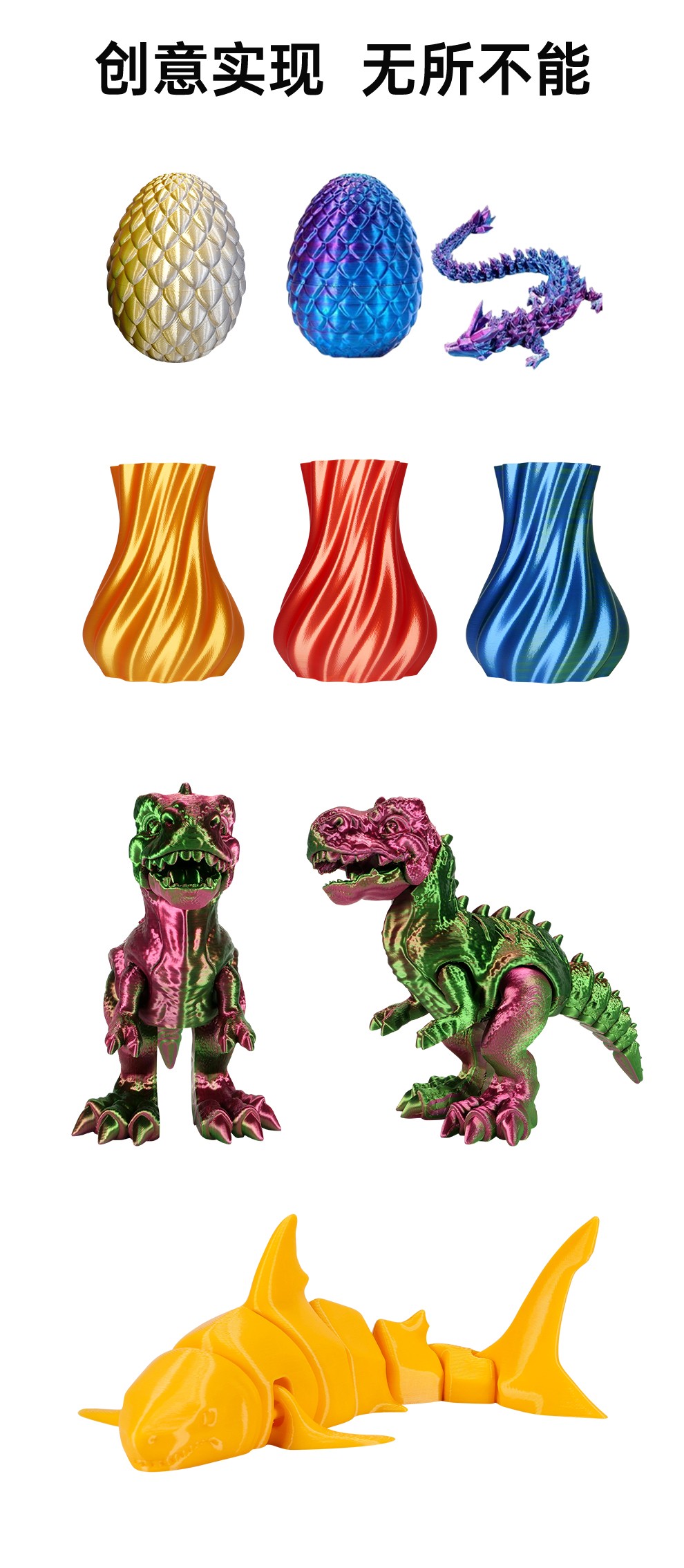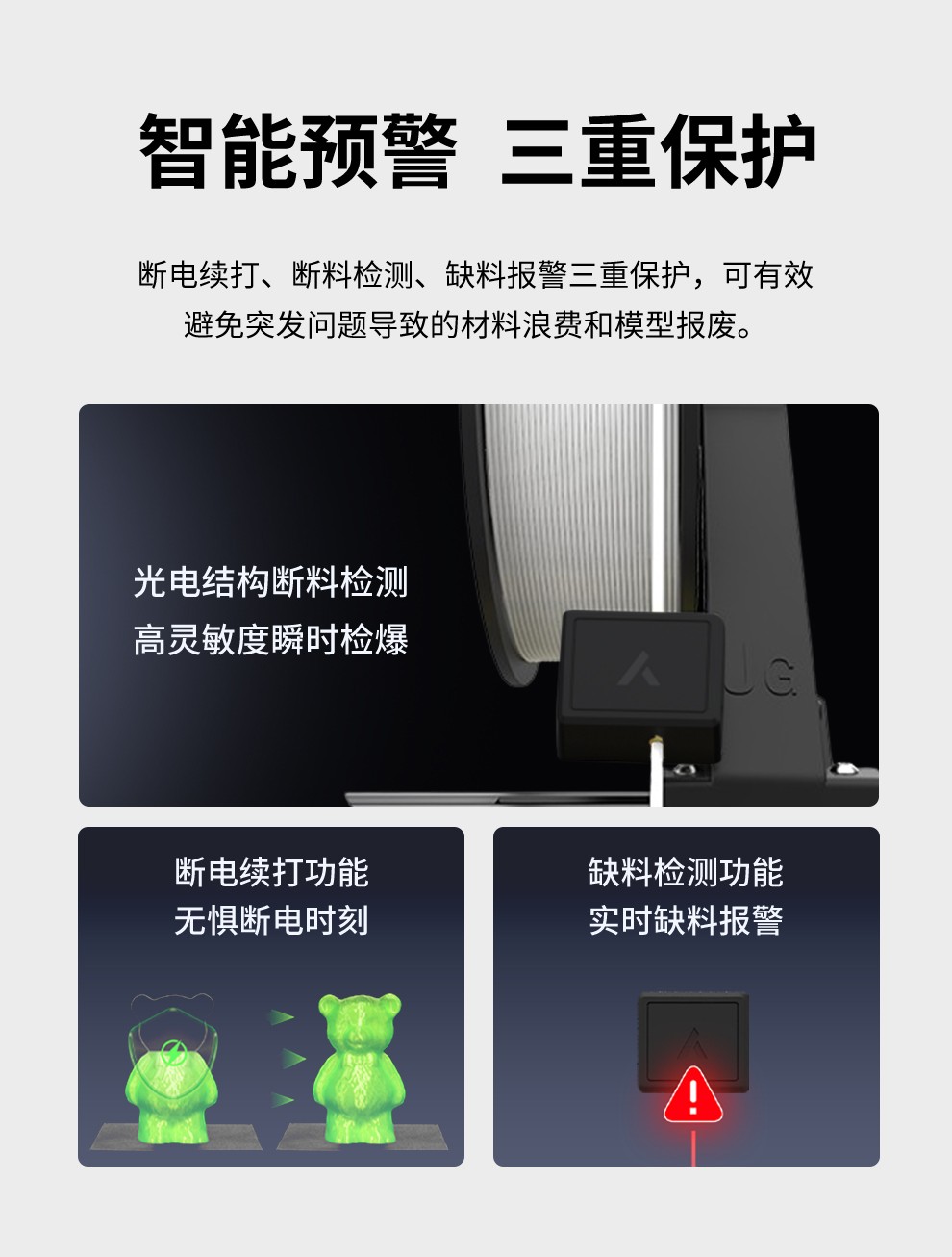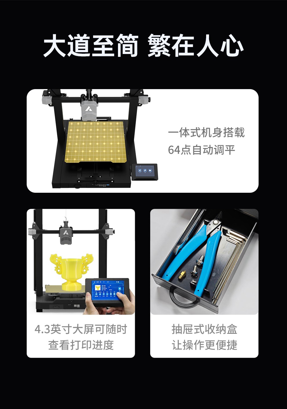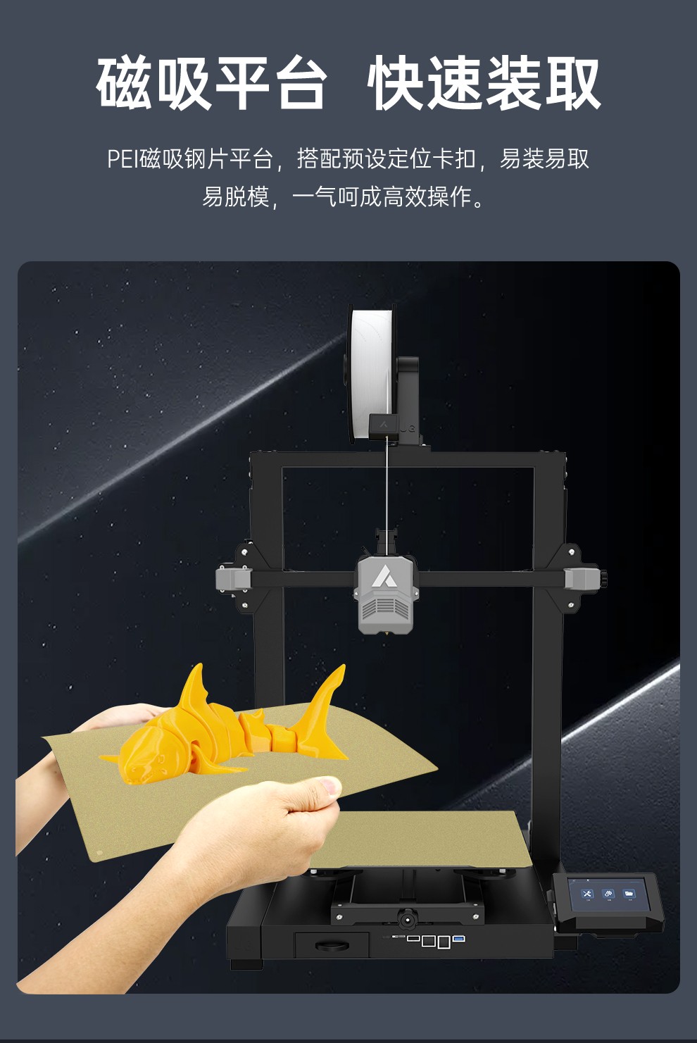 300*300*350mm最大成型空間·9.5倍放大擠出,使出料更均勻,成型更出色,搭載智能風扇控制系統,讓高達8500r/min的轉速降低噪音,還可以模型散熱更全面的同時高速打印