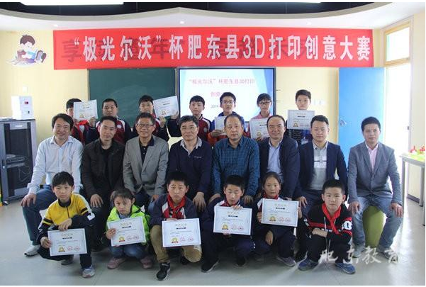 極光爾沃教育負責人和肥東縣領導、獲獎老師及其學生合影留戀