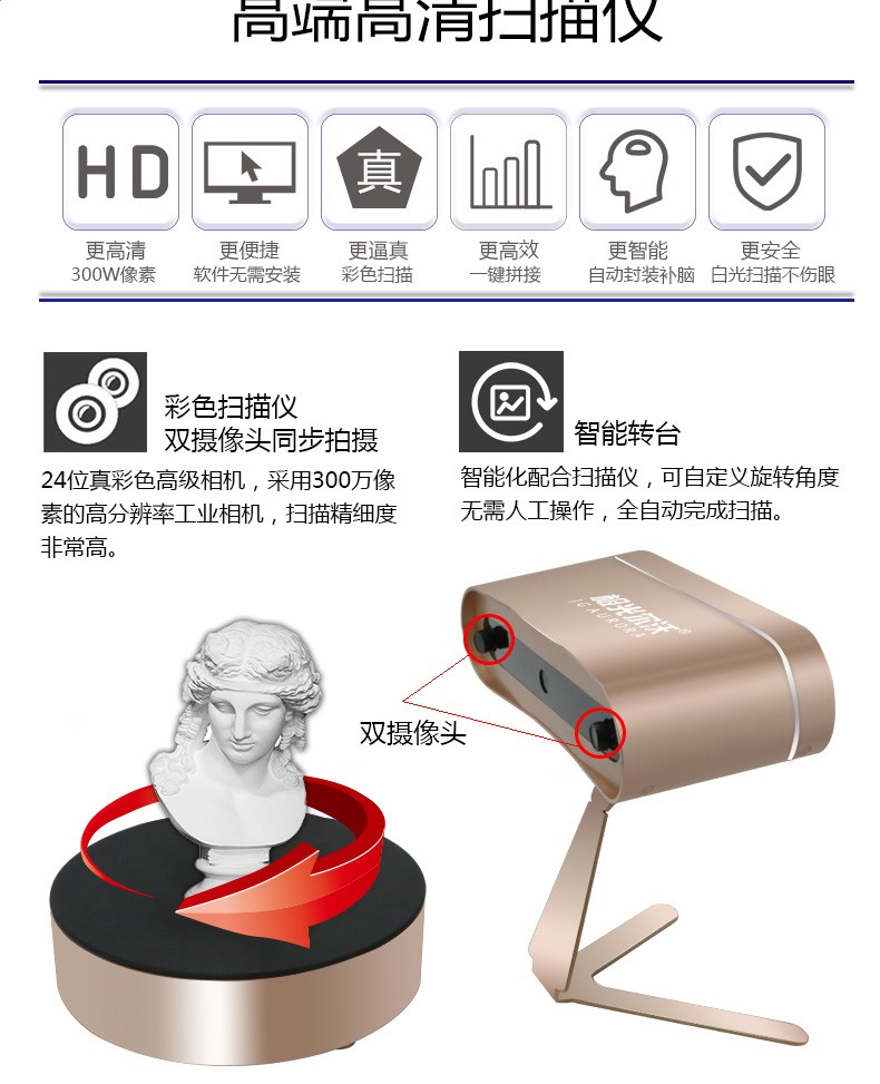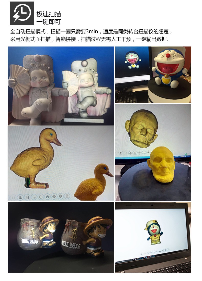 無需建模,輕松掃一掃便可自動拼接,無縫對接3D打印機軟件可自動生成封閉模型直接打印。