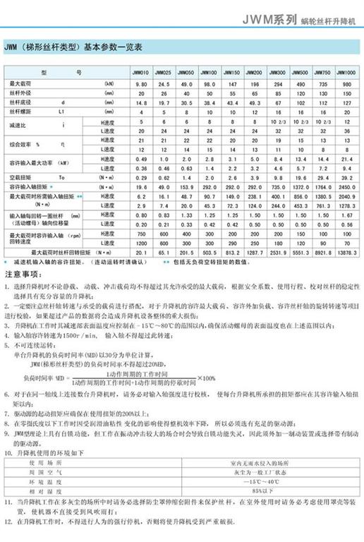 JWM升降機(梯形絲桿類型)基本參數(shù)一覽表